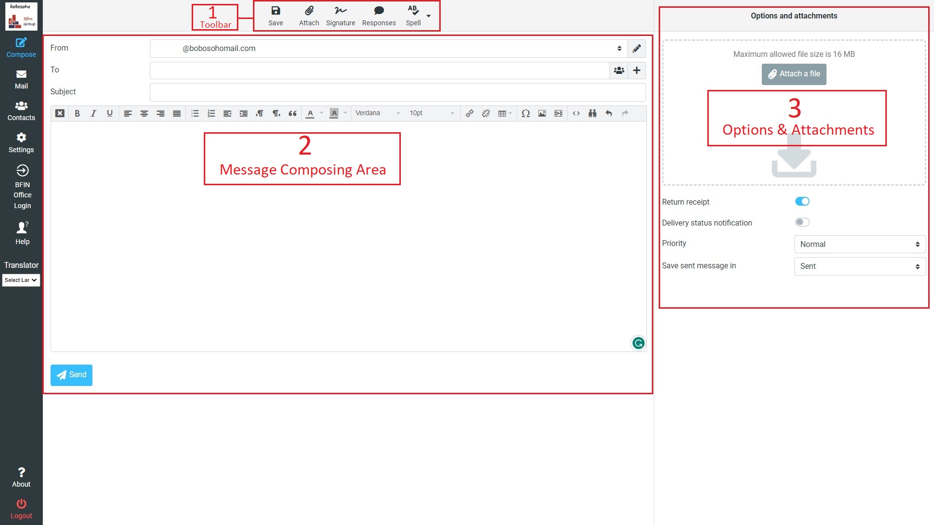 File Attachment: Here you can attach your files for sending. In bobosohomail you can attach maximum 16MB file per email.