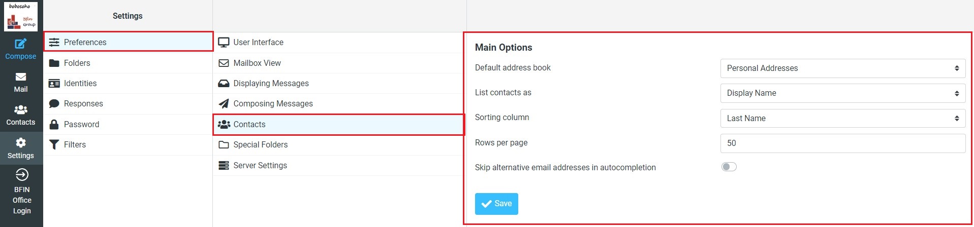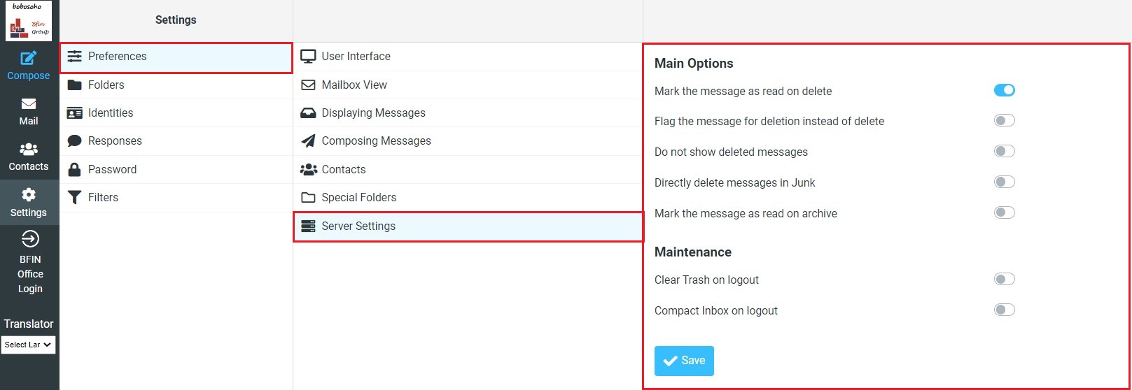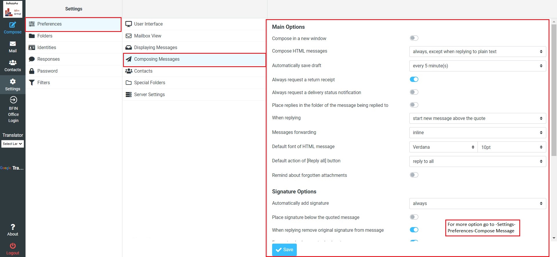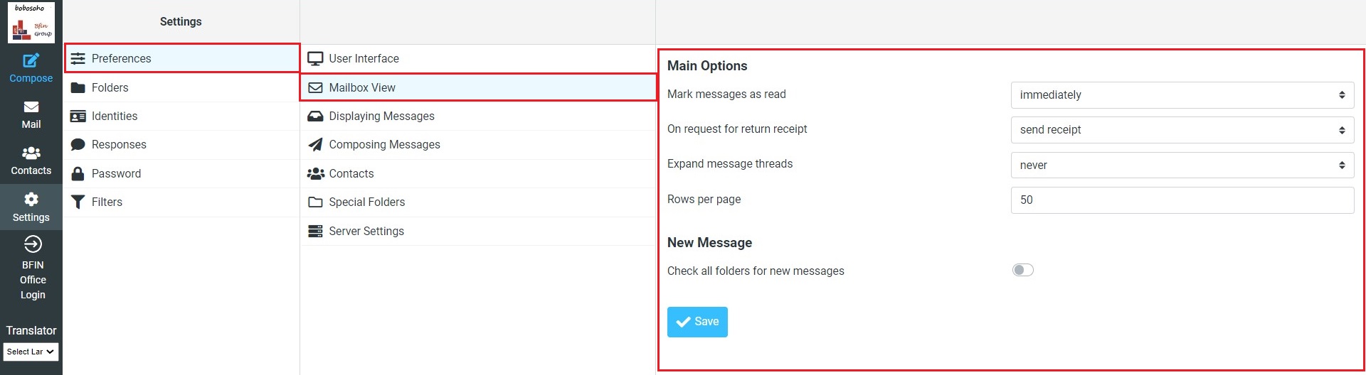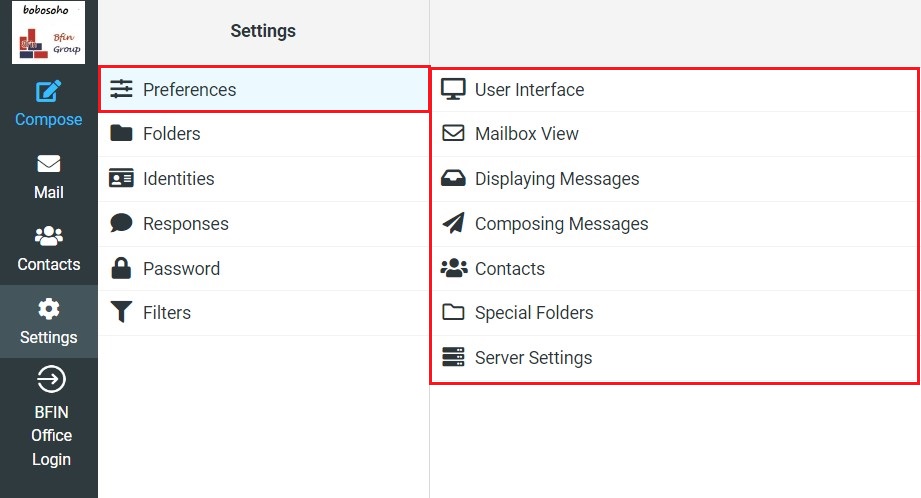 The user preferences let you adjust various options and settings that control the behavior and the UI of the webmail application. The settings are grouped by the following sections: