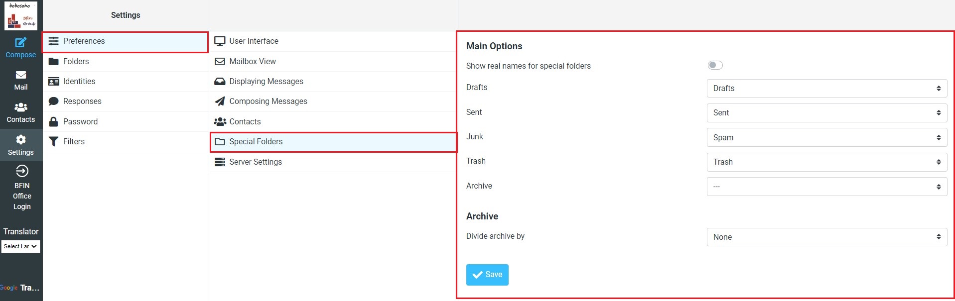 Some folders have special purposes and are used by system processes to store messages. This form allows you to choose which folders are used to store Drafts, Sent or deleted messages (Trash).